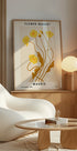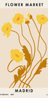 A colourful, graphic poster where lush flowers unfold in harmonious shapes around the striking typography 'Flower Market – Madrid'. The expression captures the feeling of a lively market: the scent of fresh bouquets, warm tones and a playful balance between text and motif, perfect for energizing the room.