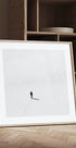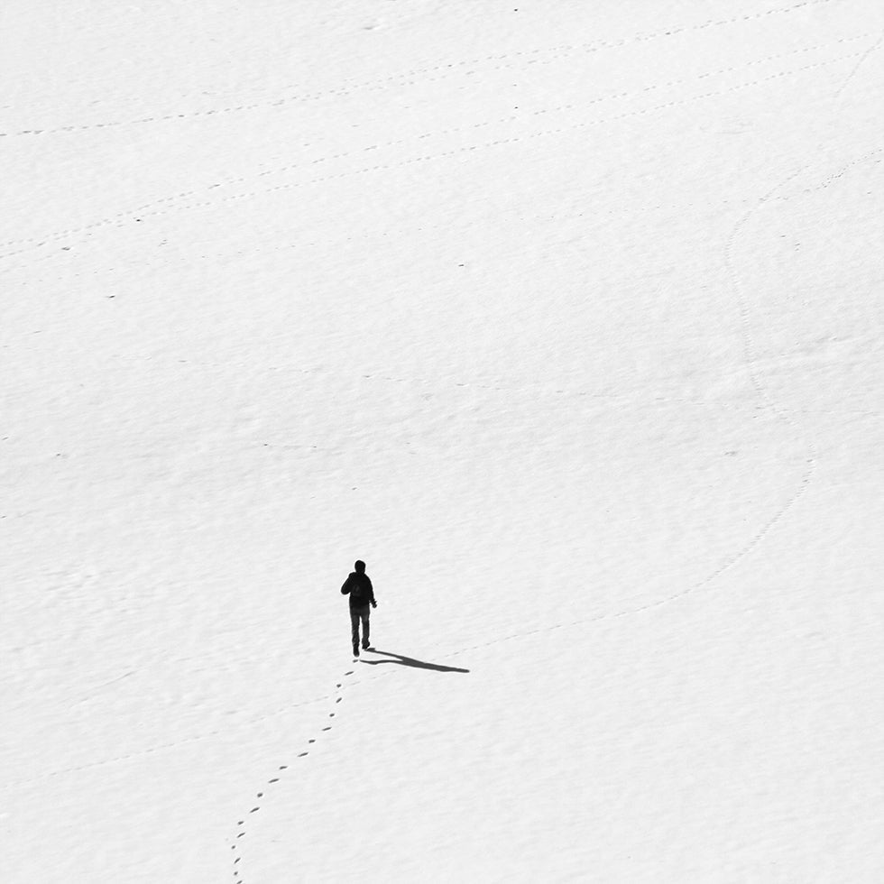 A poetic, black-and-white aerial photograph of a snowy landscape, where a single person and their footprints cut through the white silence. The long shadows and high contrast create a minimalist calm and sense of immersion. A timeless winter composition by MOSTAFA NODEH. The motif balances silence and excitement in a graphic, snowy space.