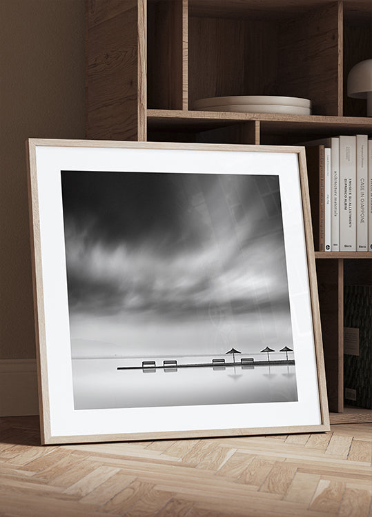 Four Benches and three umbrellas by George Digalakis is a poetic, monochrome meditation by the water: four empty benches face a mirror-like sea, while three parasols rhythmically mark the horizon. Simplicity, symmetry and quiet reflection create calm and graphic balance in the room. Perfect for modern, minimalist decor.