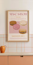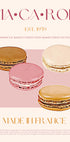 French macaron poster featuring colorful meringue-based cakes, highlighting their origins and establishment in 1959. The design highlights traditional baked goods, vibrant colors and French pastry art.
