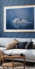 Frosty Island by Günter Kleber captures a quiet winter island surrounded by icy, mirror-like waters. Snow-covered trees stand as silhouettes in bluish tones, while the fog softly envelops the horizon. A calm, minimalist landscape, where the cold and the light meet and create an almost meditative silence. The colors range from deep blue to soft grey.