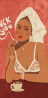 Brave Attitude Coffee Poster is a distinctive and empowering art print that combines vintage glamor with unreserved confidence. It shows a confident woman in a white lace bra, with pearls and a towel turban, enjoying her coffee and cigarette while the bold message "F*** You" rises from the smoke. With warm red tones, this provocative yet stylish artwork makes a fearless statement – perfect for adding personality and edge to modern interiors, coffee shops or art walls with attitude.