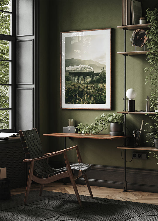 A stunning photograph of the Glenfinnan Viaduct, where an old-fashioned steam train travels over the historic bridge in the Scottish Highlands. The foggy landscape and the dramatic light create a magical and nostalgic atmosphere. Perfect for travel enthusiasts, train lovers and those who appreciate iconic natural scenery.
