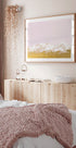 Golden mountain peaks rise in a graphic, bright winter landscape, where snow and frost draw sharp lines against the warm glow. Abstract shapes form rhythmic layers of hills and peaks that create calm and drama at the same time. An elegant, Nordic motif by Gemma Bardot that captures cold and shine and quiet grandeur.