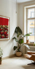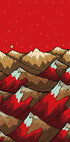 Golden and red mountain peaks rise in layers of geometric shapes, like a quilted winter landscape bathed in quiet December light. Snow-dotted slopes and deep carmine nuances meet fine gold accents and create rhythm and calm. A modern, festive landscape by Stephen Wade, ideal for Nordic minimalism. Perfect as a warm color accent in the living room or entrance hall.
