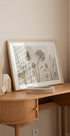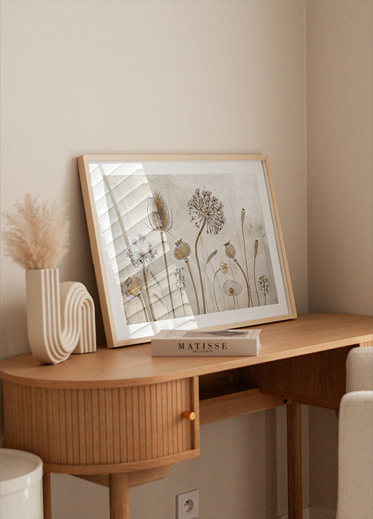 A delicate and soothing botanical art print showing an elegant arrangement of dried flowers and seed heads in soft, natural tones. The fine details and muted color palette provide a calm, timeless beauty, making it a perfect choice for bedrooms, living rooms or nature-inspired interiors.
