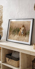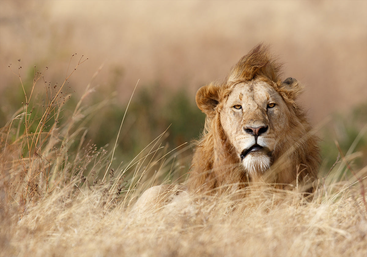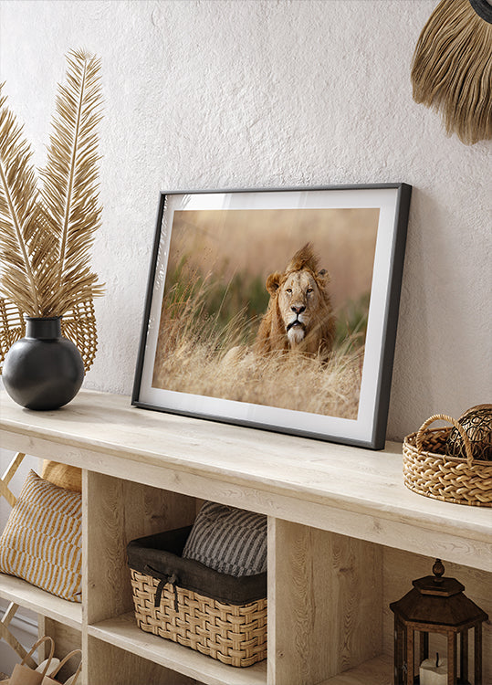 Commanding and serene, a male lion stands in wind-swept savannah grass, his mane billowing like flame as soft bokeh melts the Serengeti into gold. Every whisker and amber gaze declares the wild's quiet authority. Captured in Tanzania by photographer Ali Khataw, this portrait crowns any space with untamed majesty.