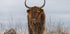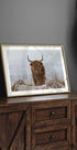 A majestic Scottish Highlander stands calmly in a snowy landscape, its long, brown fur dusted with rime and its horns graphic arcs against the white horizon. The muted winter palette and misty cold create Nordic calm and rural poetry. The photograph is by Jaap van den Helm. Recorded in Veluwezoom, the Netherlands, and ideal for Nordic, rustic decor.