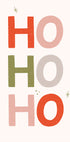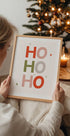 A playful, modern Christmas poster with the iconic "HO HO HO" set in large, graphic typography. Clear red, green and pink colors create strong contrasts and a fresh, minimalist atmosphere. The clean composition and the rhythm of the repetition give the wall energy and instant Christmas atmosphere. Perfect as a graphic statement in the living room, entrance hall or children's room.