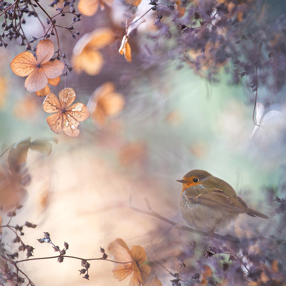 Hydrangea fantasy by Teuni depicts a little redhead among frost-kissed hydrangeas, bathed in soft bokeh and light snow. Pastel colors and soft light give the motif a dreamy, adventurous aura, where the poetry of nature meets the quiet magic of winter and invites tranquility inside. A poetic eye-catcher for botanical souls.