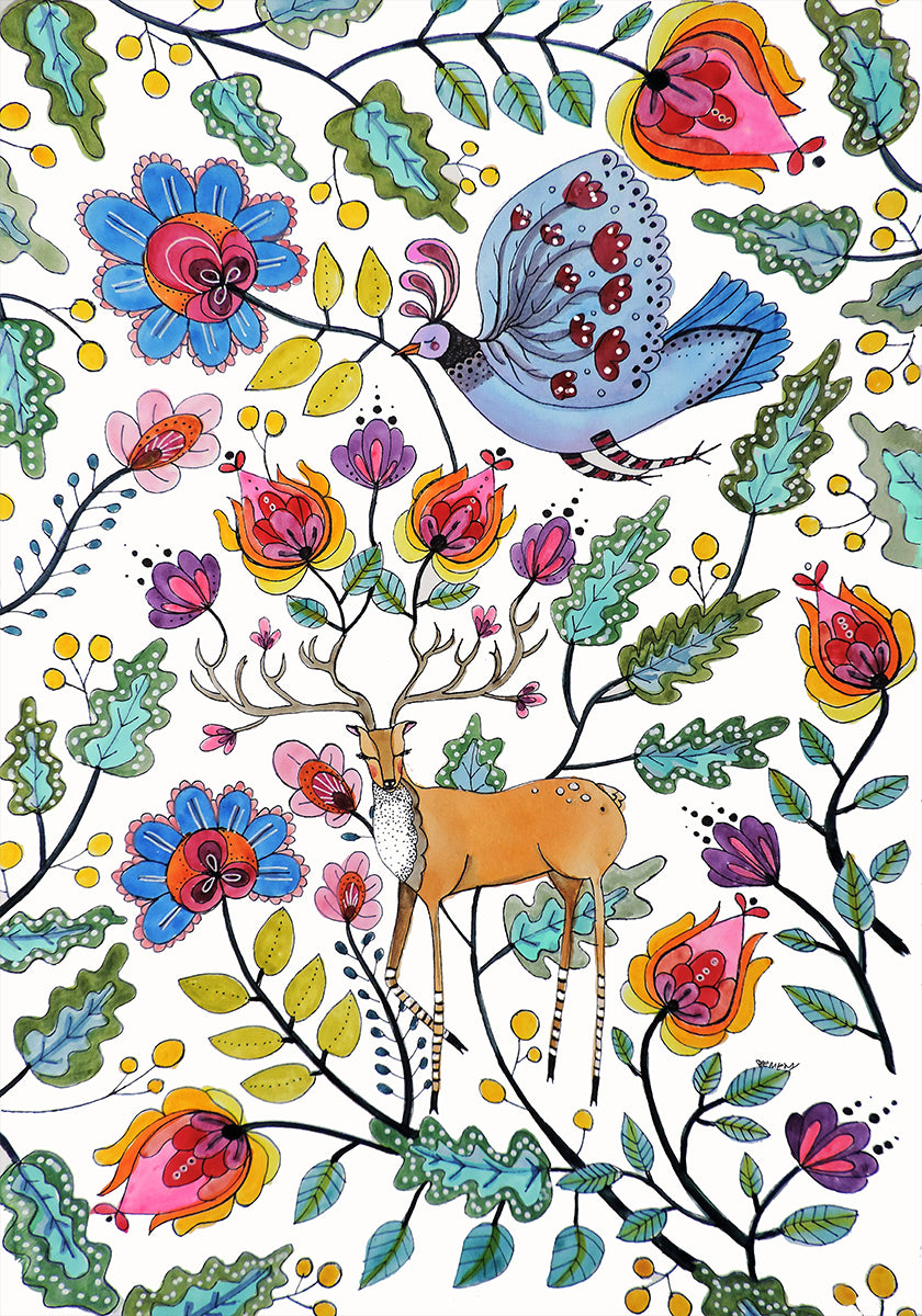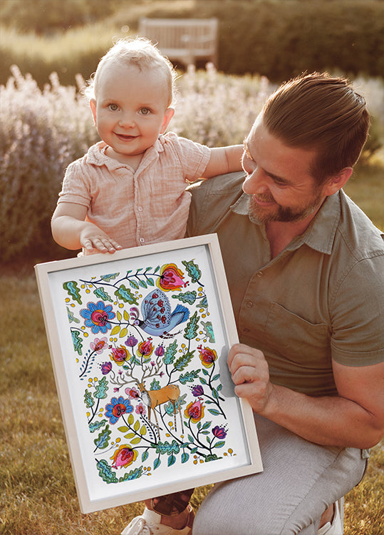The Il Etait Une Fois poster (French for "Once upon a time") is an imaginative and enchanting piece of art that transports the viewer to a magical fairytale world. A graceful stag with blooming antlers stands among vibrant flowers, while a beautifully patterned blue bird glides across the scene. Rich in detail and filled with vibrant colors – pink, yellow, blue and green – this work exudes joy and wonder. Perfect for children's rooms, creative studios or any space that celebrates imagination and nature, it captures the imagination with its playful, storybook-inspired charm.