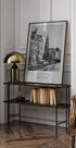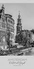 Melanie Viola's black-and-white city portrait captures De Munt in the heart of Amsterdam: the Munt tower is reflected in the canal, bicycles lean against the railings, and narrow houses rise in graphic rhythm. An elegant, modern composition, where the typography "AMSTERDAM" sets the focus and gives the motif urban pulse and historical weight.
