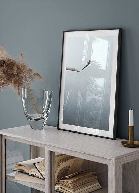 A clean and symbolic artwork featuring a figure leaping off an edge into the unknown. The poster captures a moment of trust, courage and surrender – ideal for contemplative spaces and reflection.