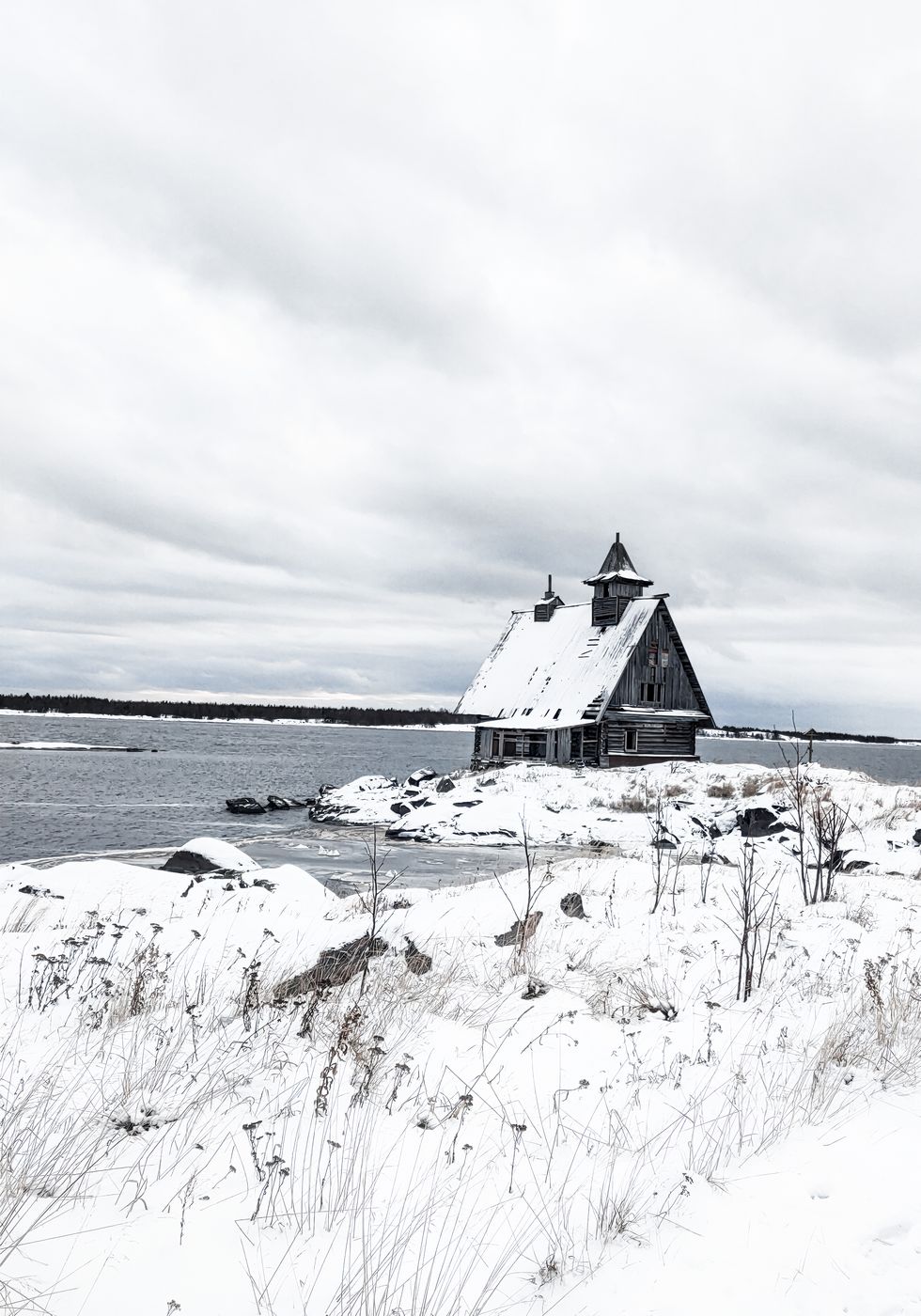 An evocative photograph of an abandoned wooden cabin standing alone by a frozen lake, surrounded by a calm, snowy landscape. The muted colors and the open sky create a feeling of solitude, mystery and the raw beauty of nature's untouched wilderness. Perfect for lovers of Nordic aesthetics, minimalism and winter landscapes.