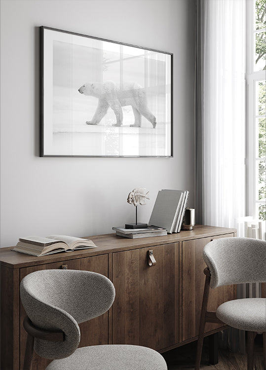 A bright, minimalistic motif of a lone polar bear wandering through the snowy arctic landscape of Churchill, Canada. Marco Pozzi captures the quiet poetry of the cold in pure white shades, where tracks in the snow and the animal's calm gaze create a calm, timeless atmosphere and Nordic elegance. A motif that brings the grandeur of nature into the home.
