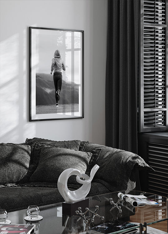 A striking black and white photograph that captures the essence of persistence and determination. Featuring a runner in motion against a mountain backdrop, this artwork symbolizes strength, endurance and determination. A perfect motivational poster for fitness enthusiasts and those who live an active lifestyle.