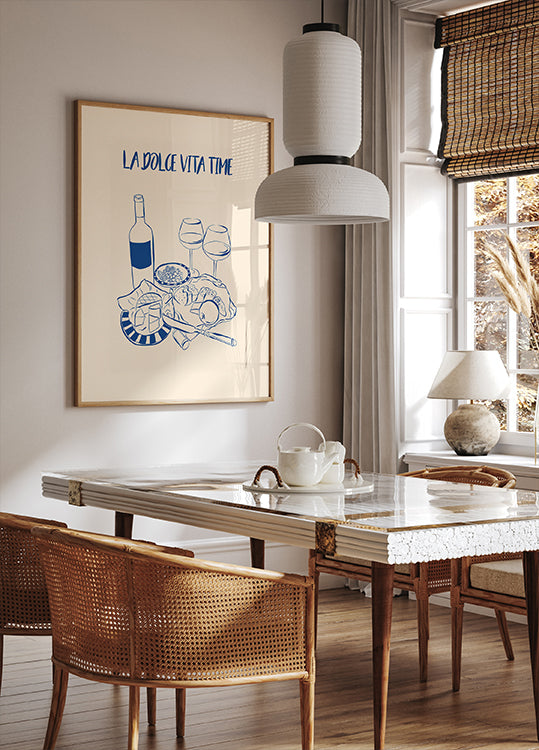 A simple and cozy line art poster with wine, cheese, fruit and bread - inspired by the Mediterranean. The text "La Dolce Vita Time" frames the good life, relaxation and Italian charm. Ideal for the kitchen.