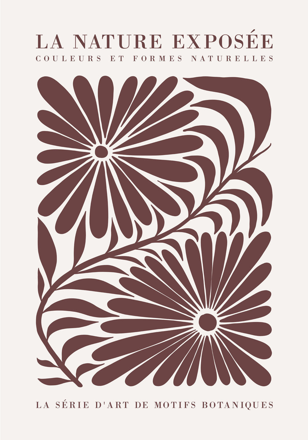 A stylish botanical art poster featuring two abstract flowers and elegant leaves in a natural earth tone. Inspired by vintage French design, this minimalist illustration combines nature and sophistication - perfect for modern decor.