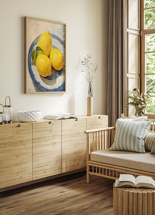 A classic still life with three yellow lemons and green leaves on a plate with a blue border. The soft brush strokes and warm colors create a calm Mediterranean atmosphere.