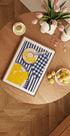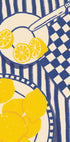 This cheerful illustration captures the lively charm of a Mediterranean summer table. Sliced lemons on a white plate, a checkered napkin and a pile of whole lemons lie on a heavily blue-striped tablecloth — and create a fresh and happy atmosphere in the kitchen. The hand-drawn, stylized style adds an artistic touch, while the yellow and blue color palette evokes memories of coastal life and sunny mornings. Perfect for bringing energy and citrus elegance into your kitchen, dining room or gallery wall.