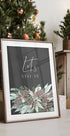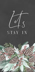 A frost-kissed floral still life with pine cones, winter berries and greenery, lightly dusted with snow, framed by cool white and blue hues. The warm invitation "Let's stay in" creates a calm, cozy atmosphere - perfect for winter's quiet moments. By artist Rosana Laiz Blursbyai. An elegant, calm focal point for the entrance hall, living room or bedroom.