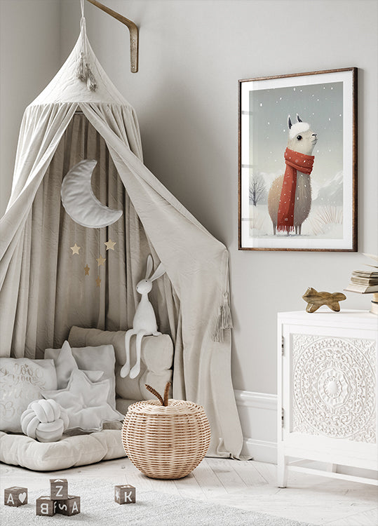 A calm llama stands in a snowy landscape, its warm gaze and light breath drawing a poetic moment of wintry stillness. The muted tones and simple lines create Nordic calm and pastoral charm in the home. An evocative motif by Bilge Paksoylu that captures the quiet presence of nature. Perfect for Nordic interiors.