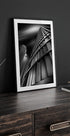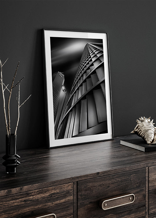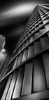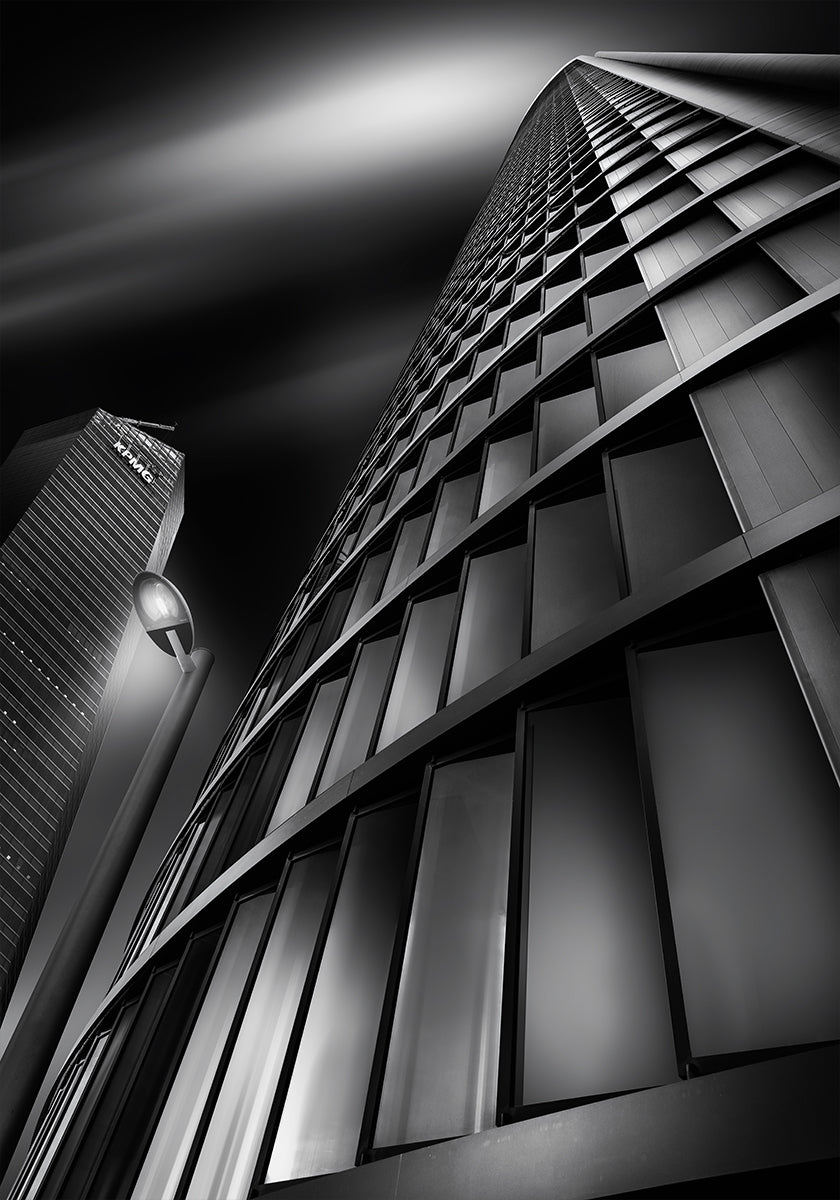 Jorge Ruiz Dueso captures a striking upward view in Madrid's CTBA: sleek glass towers converging towards a sliver of sky as a solitary streetlight punctuates the scene. Geometric lines, reflections, and deep contrasts create a dynamic urban portrait that celebrates modern architecture and the drama of light.