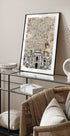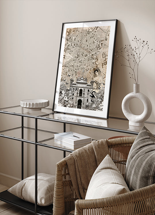 An evocative Madrid poster by Simon Goggin that captures the pulse of the city in a retro collage. A detailed city map intertwines with iconic motifs such as the Plaza de Toros, matadors and classic city scenes. Warm, sun-saturated colors and graphic shapes create a living tribute to Spain's capital. Perfect for lovers of travel, culture and graphics.