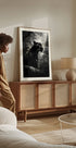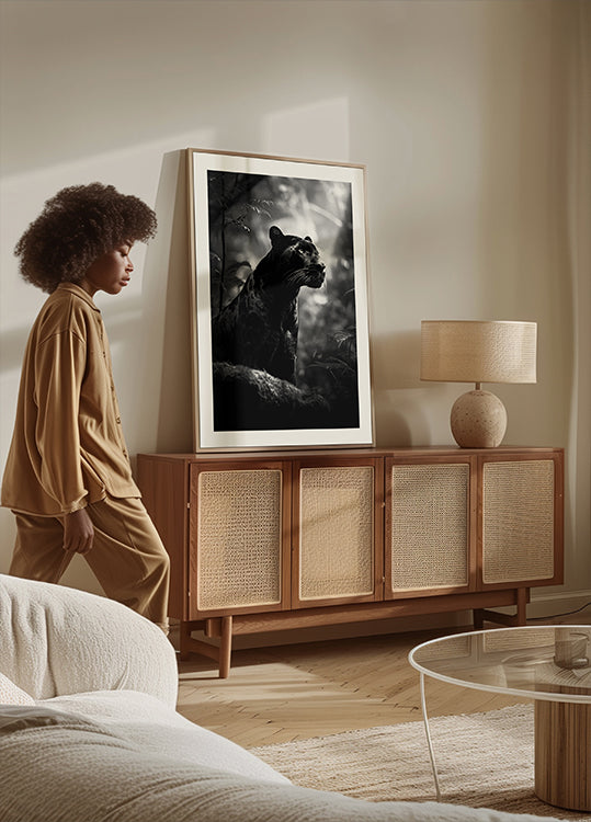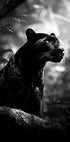 This striking black and white poster captures the intense gaze of a black panther in a misty jungle scene, bathed in dramatic light that highlights the animal's strength and mystery. The photographic composition creates a sense of stillness and tension as the panther stares off into the distance — alert and focused. Perfect for those who appreciate wild beauty, strength and elegance, and who want a strong statement in modern or nature-inspired interiors.