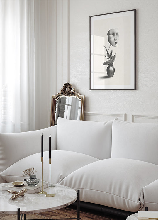 A surreal black and white illustration of a mysterious floating mask growing from the stem of a potted plant. The combination of organic and artificial elements creates a striking contrast and evokes themes such as identity, transformation and hidden emotions. A perfect addition to conceptual art and modern interiors.