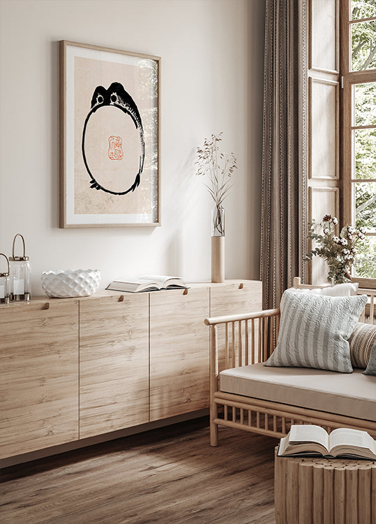 A minimalist Japanese ink drawing depicting a stylized frog in an elegant circular shape. The bold sumi-e brushstrokes create a sense of flow and harmony, similar to an enso – a symbol of enlightenment and balance in Zen Buddhism. The frog’s expressive eyes and delicate limbs add a playful yet meditative touch to the composition. A red signature stamp emphasizes the traditional aesthetic. Perfect for those who love Japanese art, Zen philosophy and unique animal illustrations.