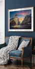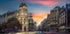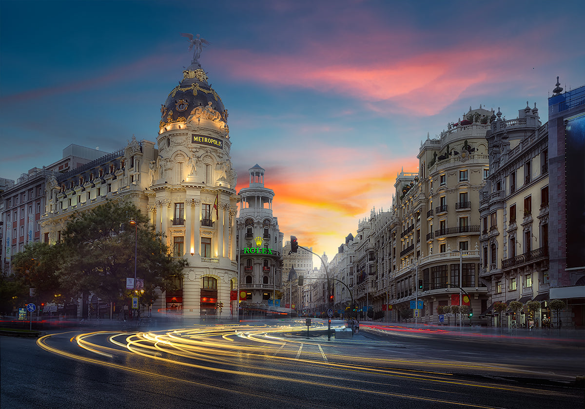 A timeless look down Madrid's Gran Vía, where the iconic Metropolis building lights up at dusk. Streaks of light from the traffic draw dynamic lines around the classic facade with the golden dome. An atmospheric tribute to the pulse of the city, interpreted by the photographer Fernando Molina. Shot in long exposure capturing movement and energy.