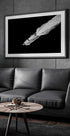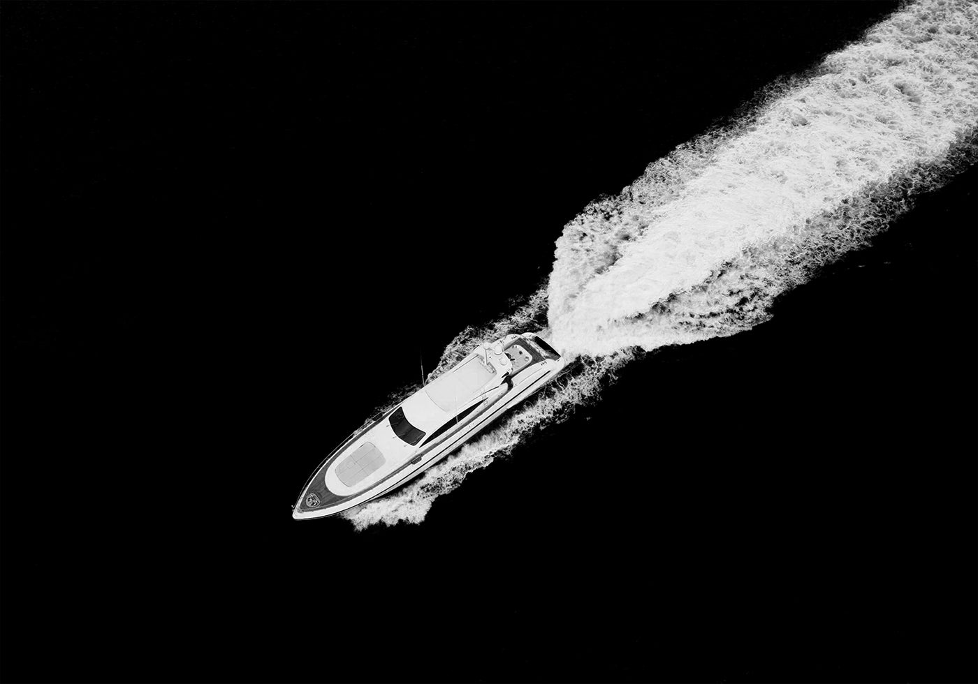 An elegant yacht cuts through the dark water in stark contrast, captured from above in refined monochrome. This minimalist motif celebrates freedom, precision and the aesthetics of movement – ideal for modern interiors with a sense of style and calm.