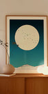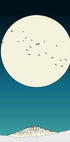 Moonlit Ascent by Nicholas depicts a calm night where a full moon rises above snowy mountain silhouettes. Deep blue hues form a soft gradient towards the horizon as birds glide silently by. The simple, graphic expression and the clear lines create a dreamy, meditative atmosphere. A minimalist night landscape with snow moon and mountain peaks in contrast.