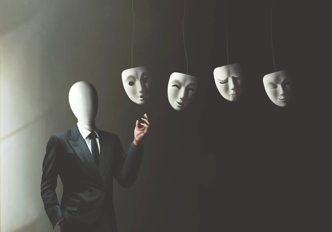 A modern surrealist work in which an anonymous man in a suit confronts hanging masks, each with unique expressions. The work explores the inner self, emotions, and the changing identities we carry in different contexts.