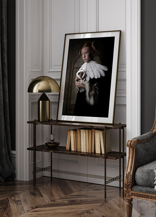 By Dutch artist Carola Kayen-Mouthaan, this evocative portrait shows a composed young woman in vintage, medieval-tinged dress, braided hair and feathered collar, sharing the frame with a gentle skunk. Dramatic, nostalgic lighting and refined textures lend old-world elegance with a playful, fairy-tale twist, with echoes of Renaissance portraiture.