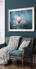 This elegant macro photograph captures a delicate flower in soft white and blue hues, highlighting the petals' veins and glistening dewdrops. The dreamy mood and detailed close-ups create a sophisticated and soothing piece of art, perfect for a modern botanical picture wall.