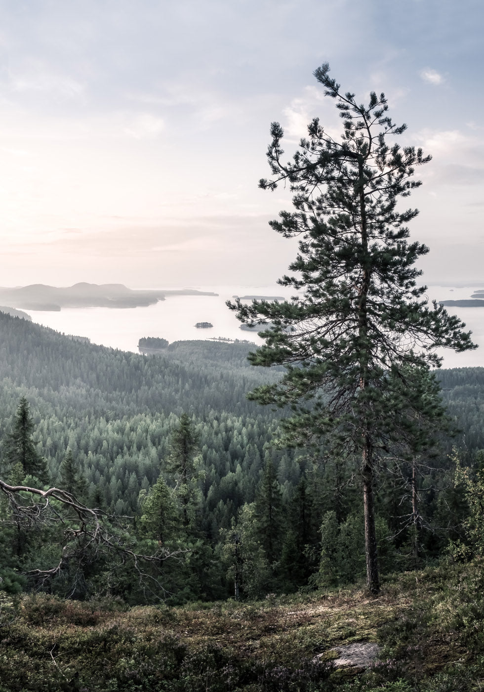 A serene landscape that captures the beauty of a Nordic forest overlooking a large lake. A lone pine tree stands in the foreground, while endless layers of conifers disappear into the misty horizon. The soft pastel sky enhances the calm and dreamy atmosphere, making this artwork a perfect addition to a nature-inspired interior.