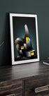 Odd shapes by Juan López Ruiz unites abstract forms and architectural rhythms in a playful composition. Graphic layers and sharp angles dance in warm yellow hues with bold contrasts that hint at Madrid's urban space. A modern, colorful statement poster that adds dynamism and personality to any wall.