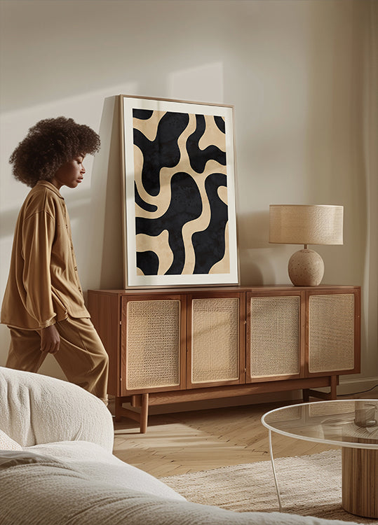 A striking abstract artwork with bold black, organic shapes flowing over a warm beige background. The undulating, free-flowing design and textured surface provide a modern yet earthy feel — perfect for Japandi, Scandinavian or contemporary interiors.