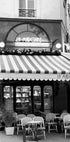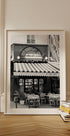 A charming black and white photograph of the Parisian café La Marquise, with its striped awning, bistro chairs and timeless street atmosphere. This print captures French café culture and brings an authentic Parisian touch to the home, while evoking the romance of everyday life in the City of Light.