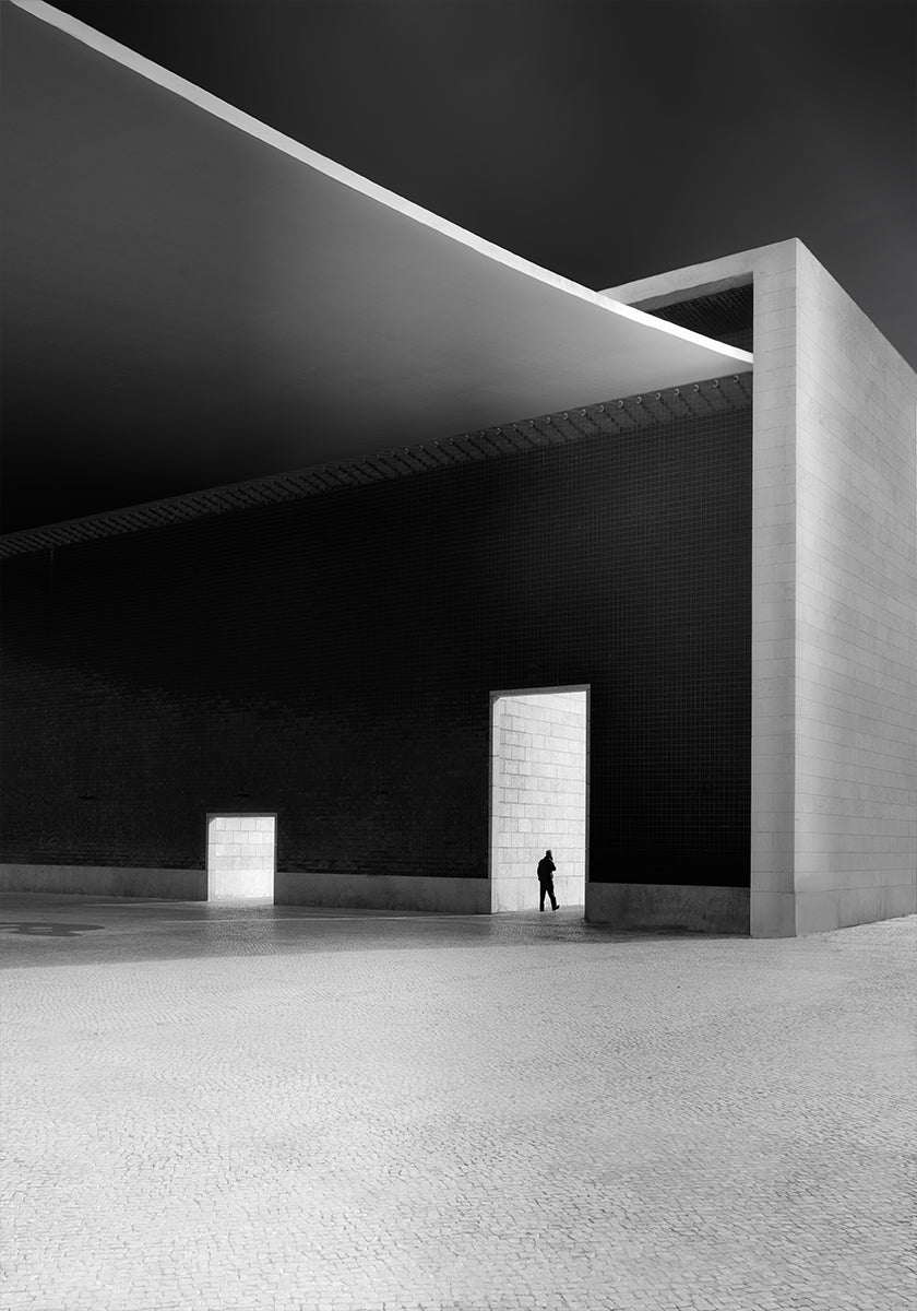 Passerby by Olavo Azevedo captures a fleeting figure crossing the crisp geometry of Lisbon's modern architecture, where sweeping curves and clean lines meet dramatic light and shadow. A homage to Álvaro Siza's poetic minimalism, this composition frames movement against serene, sculptural forms. Elegant and quietly dynamic.