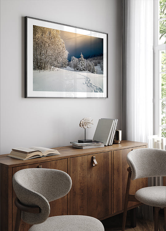 A quiet winter path winds through a deep forest, where frost-heavy firs and fine tracks in the snow lead the eye towards a soft, misty morning light. The cool palette and clean horizon create Nordic calm and reflection. An atmospheric nature motif by the photographer Christophe Baudot. Perfect for framing the quiet poetry of winter.