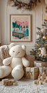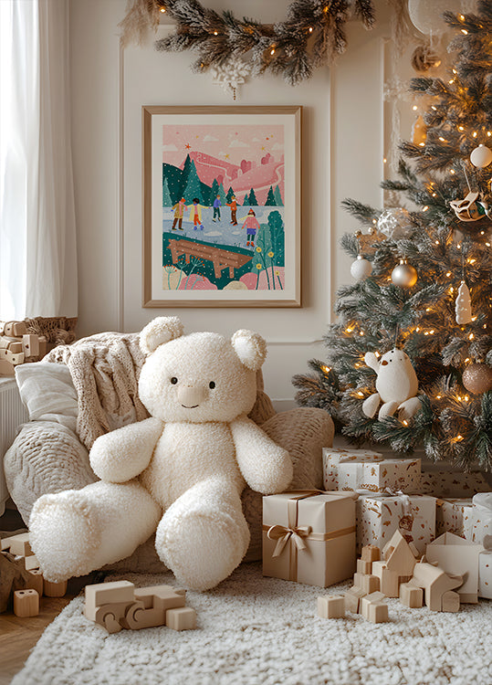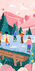 A playful winter motif by Bea Müller: on a frozen lake, children and adults skate around a decorated Christmas tree while snowflakes dance in the air. The background reveals soft mountains and dark spruce that frame the festive mood. The colors are warm and lively, full of winter magic. A tribute to family, community and the joy of the season.