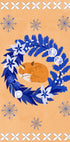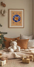 A charming winter illustration of a warm orange fox surrounded by a folk-inspired wreath of teal leaves, red berries and delicate flowers. Snowflakes dance in an indigo night, creating a cosy, fairytale atmosphere. Created by artist Aliya Putrus – perfect for children's rooms and winter homes. A sweet gift idea in the colors of Christmas.