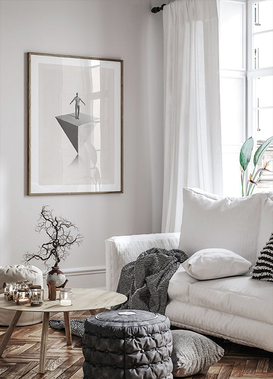 A man stands balanced on the tip of an inverted pyramid with open arms – an image of inner peace and mental equilibrium. A simple but thought-provoking work in subdued tones.