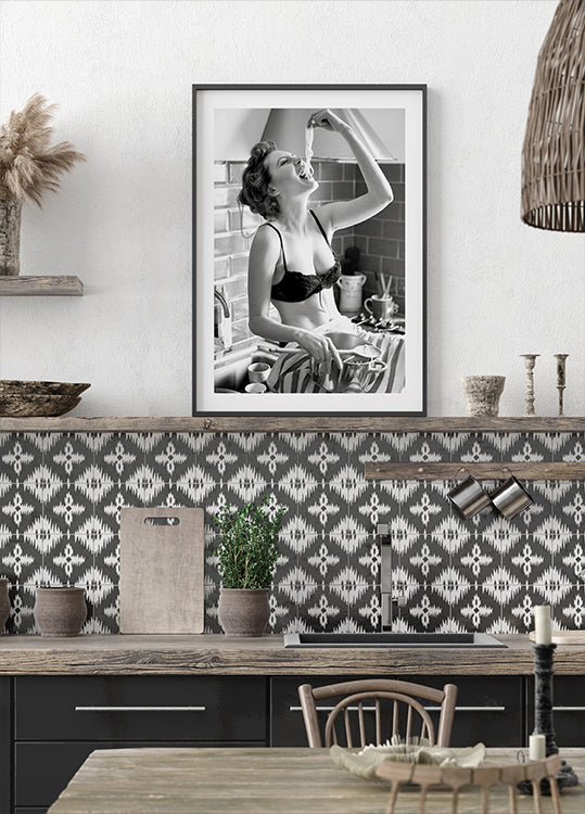 A playful and bold black and white photograph of a woman enjoying spaghetti in a vintage inspired kitchen. With a relaxed attitude, she exudes confidence and humor, making this artwork a stylish and fun addition to modern interiors. Perfect for kitchen decor, foodies and photography enthusiasts.