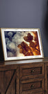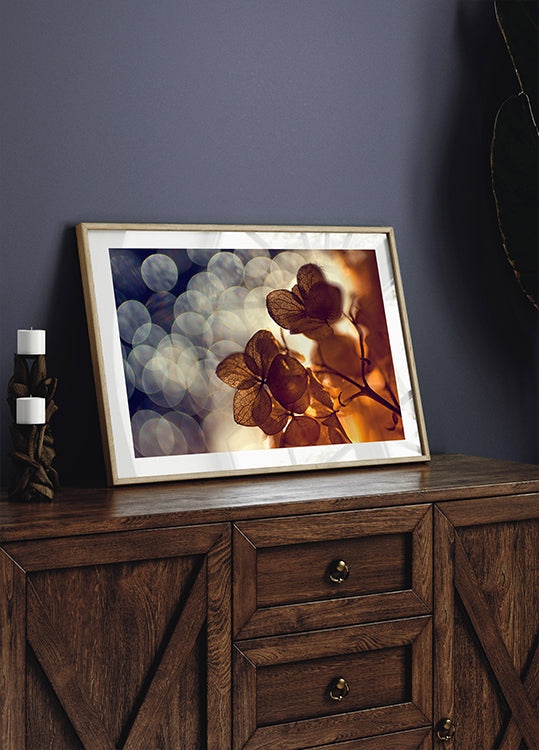 This enchanting macro photograph captures dried hydrangea leaves glowing in warm golden light against a dreamy background of circular bokeh. The fine veins in the leaves provide intricate details, while the luminous atmosphere radiates elegance, nostalgia and timeless botanical beauty.