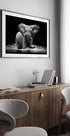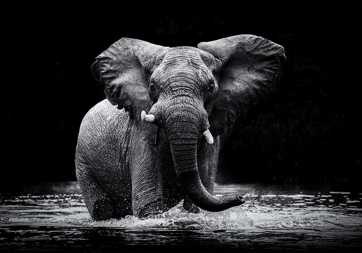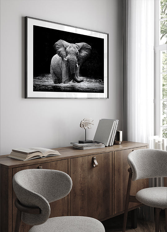 A dramatic black and white poster of an elephant breaking through the waters of the Kafue River in Zambia. Low-key lighting highlights wrinkles, muscles and splashes of water, while the majestic calm contrasts with the power. Photographed by Gorazd Golob – a strong, timeless motif for modern spaces. Perfect as an eye-catcher in the living room, office or gallery.