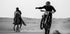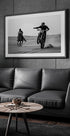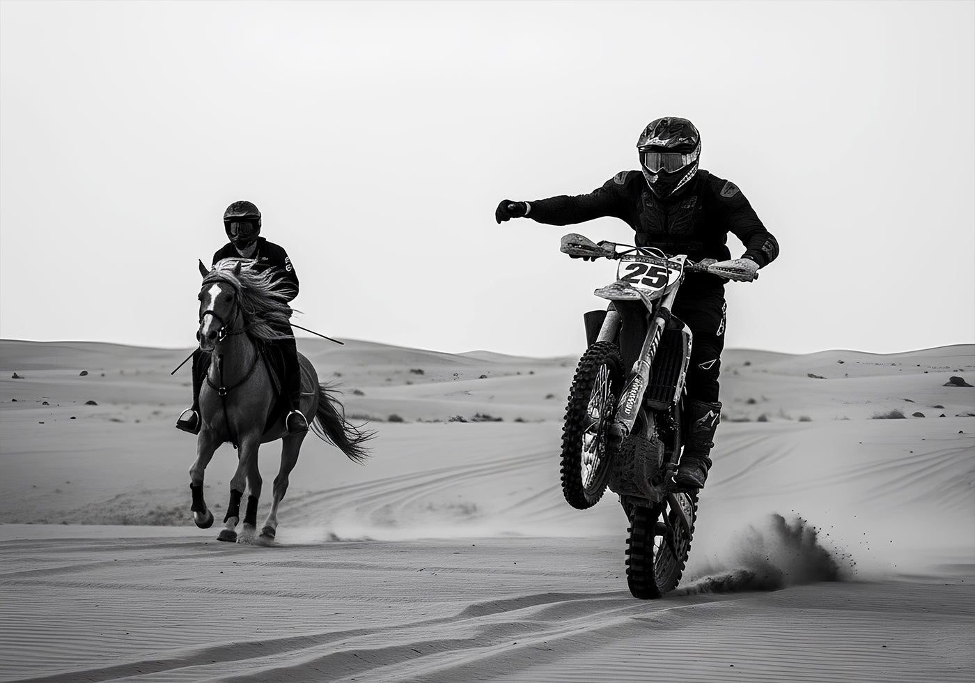 A dramatic black-and-white poster that captures the contrast between man, machine and nature — a motocross rider racing a galloping horse through the desert. This dynamic photograph exudes speed, strength and freedom, ideal for modern and masculine homes.